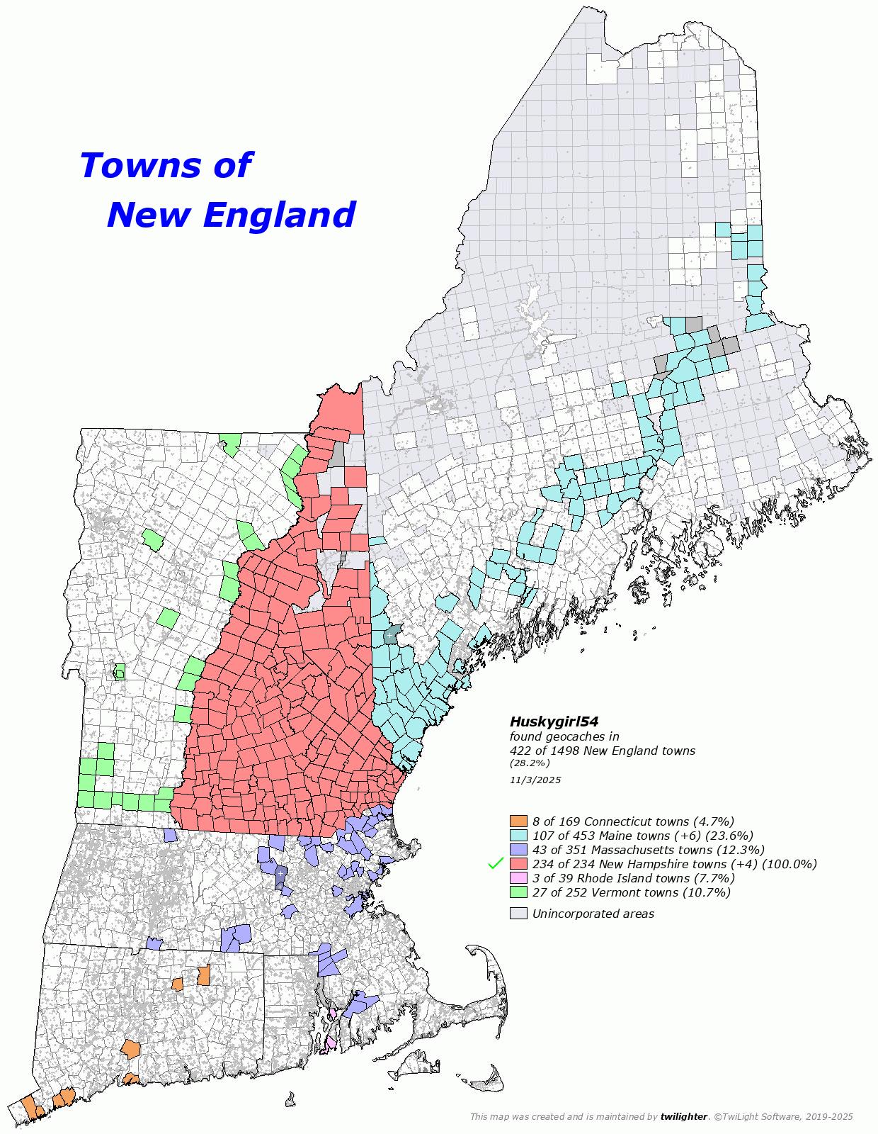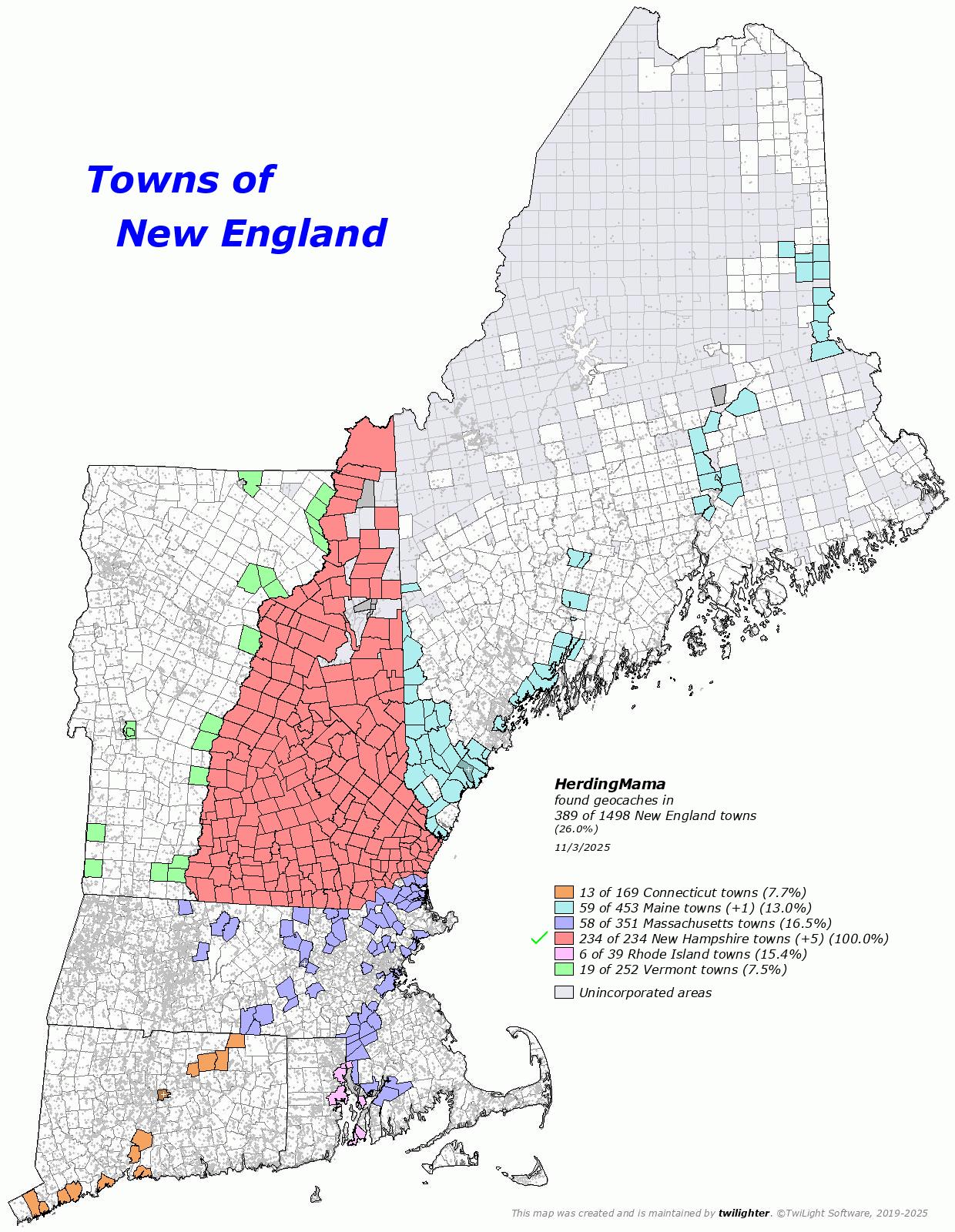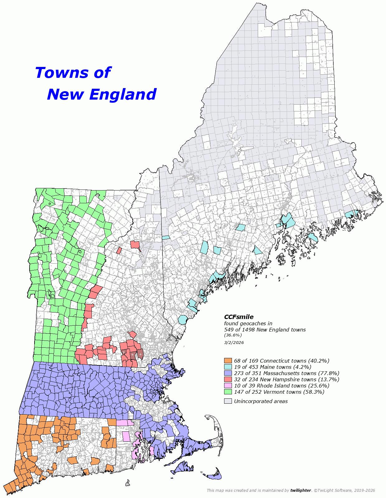 New England now has 1498 towns! On July 1, 2022, Vermont's village of Essex Junction split off from the town of Essex to become its own city... which now increases the number of Vermont towns to 252. Some of you have already found a cache in Essex Junction, so your total may increase by one if you've also found a cache in Essex. If you previously only found one cache in Essex, you may want to plan a trip to Vermont's newest town. |