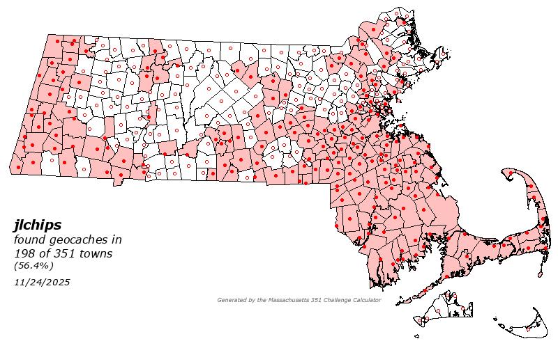 As of November 24 2025, there are 16500 active caches placed around Massachusetts.