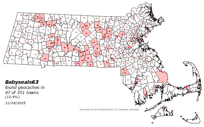 As of November 24 2025, there are 16500 active caches placed around Massachusetts.