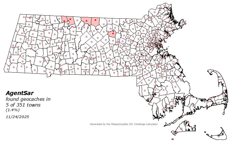 As of November 24 2025, there are 16500 active caches placed around Massachusetts.