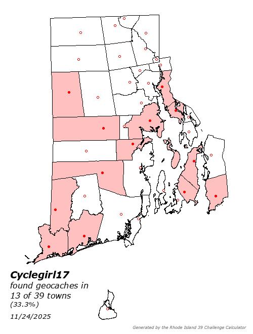 | Top Finders of Rhode Island Geocaches | Plots all your finds across Rhode Island and lists where you rank among other top RI cachers. |