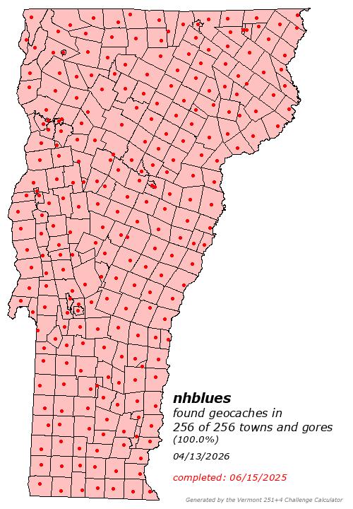 | Town Challenges -- Wall of Fame | A list of cachers who have completed both the New Hampshire 234 and the Massachusetts 351, and those that have also completed the Rhode Island 39+1 or the Vermont 251+4. |